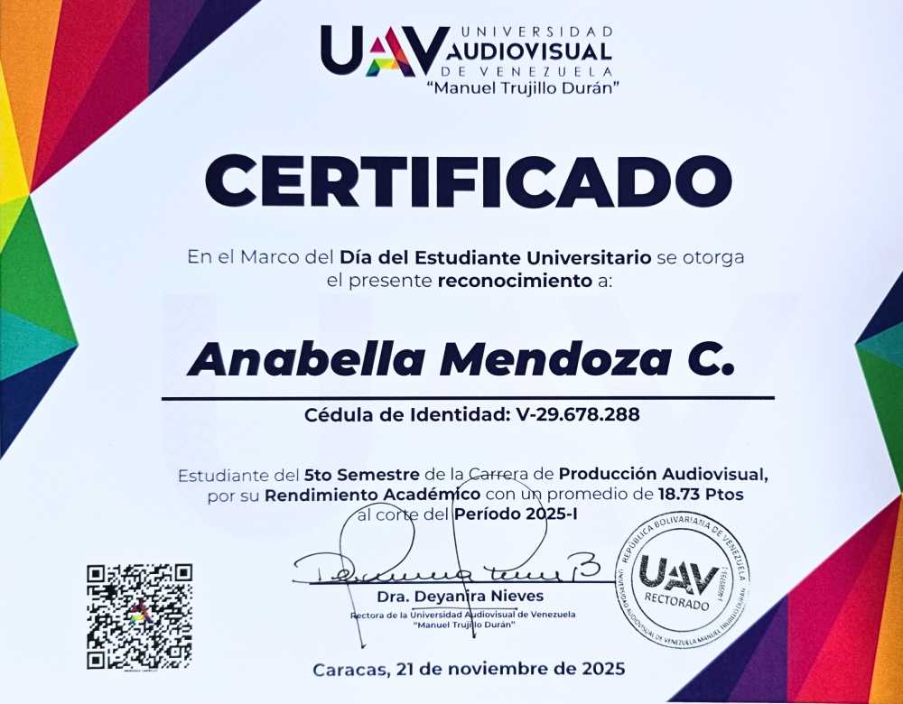 MENDOZA CARRILLO ANABELLA, C.I.: 29678288, carrera: LICENCIATURA EN PRODUCCIÓN AUDIOVISUAL