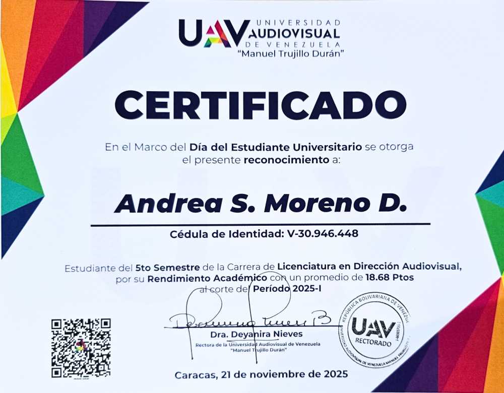 MORENO DURAN ANDREA SOPHIA, C.I.: 30946448, carrera: LICENCIATURA EN DIRECCIÓN AUDIOVISUAL