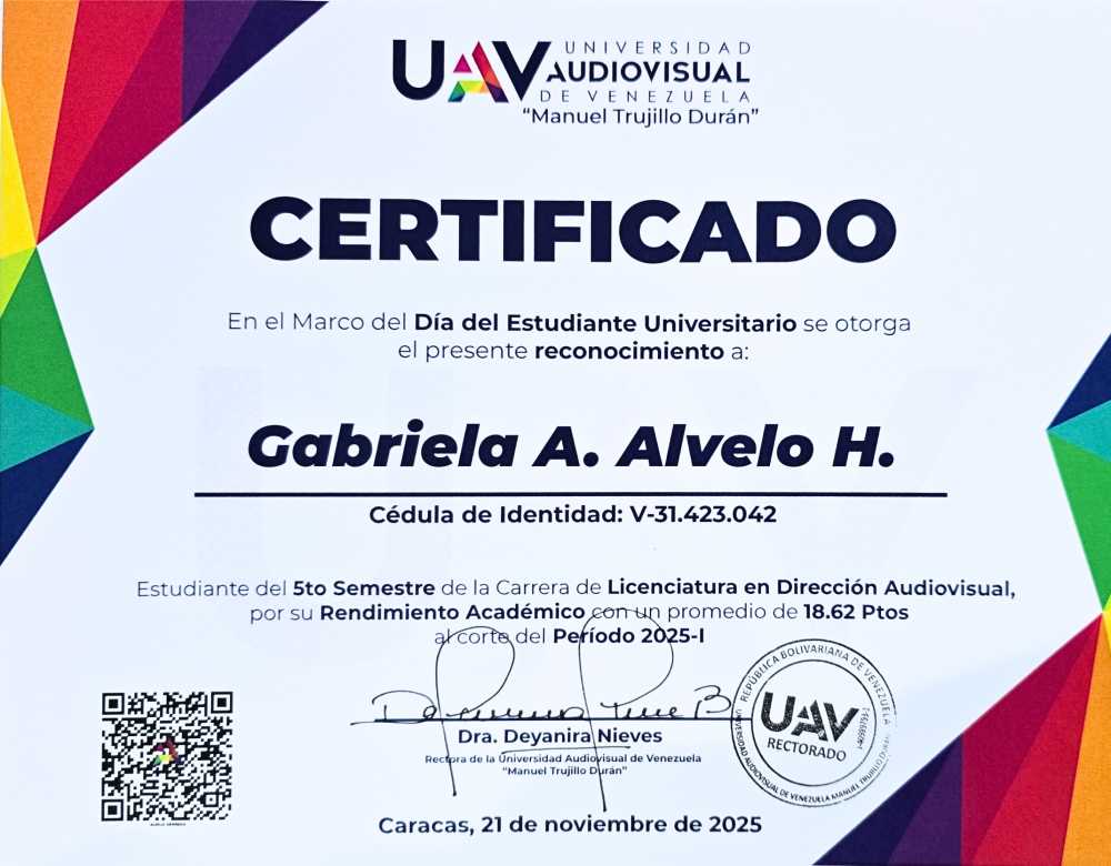 ALVELO HERRERA GABRIELA ANDREA, C.I.: 31423042, carrera: LICENCIATURA EN DIRECCIÓN AUDIOVISUAL